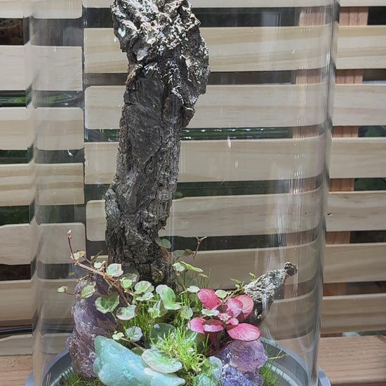 Bring the tranquility of a forest ecosystem into your home with this curated and handmade moss terrarium with specially selected choice of moss and plants. Featuring three distinct moss varieties layered over natural tree bark, this living display creates a self-sustaining ecosystem that thrives with minimal maintenance. Each terrarium will include a plastic base and a glass dome the crystal-clear glass dome protects your moss garden while allowing optimal light penetration. Perfect for desks, shelves, or windowsills, this terrarium serves as both a functional air-purifying element and a striking focal point that connects you to nature's quiet beauty. Terrariums of this variety will come with pre-grown moss and plants that will continue to grow with light and watering as well as a glass dome to cover. Lamps fitted to the terrarium base may be purchased for an additional $25.
